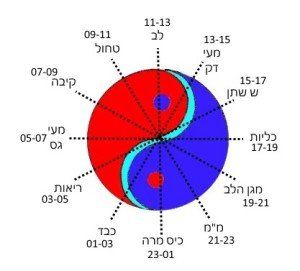 לדוגמא – הריאות נמצאות בשיא הפוטנציאל האנרגטי בין השעות 3-5 בבוקר. המעי הגס בין השעות 5-7 בבוקר לאחר מכן הקיבה, הטחול, הלב וכן הלאה. כך יוצא מצב שאיבר שנמצא בשיא, כלומר גאות, האיבר שמימולו בשעון חווה שפל אנרגטי (ראו תרשים).